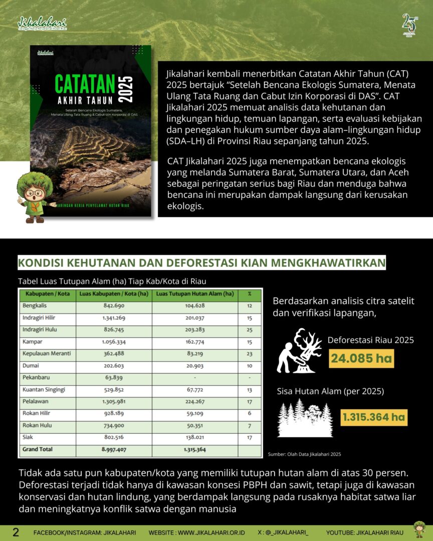 Pekanbaru, 29 Desember 2025 – Jikalahari kembali menerbitkan Catatan Akhir Tahun (CAT) 2025 bertajuk “Setelah Bencana Ekologis Sumatera, Menata Ulang Tata Ruang dan Cabut Izin Korporasi di DAS”. CAT Jikalahari 2025 memuat analisis data kehutanan dan lingkungan hidup, temuan lapangan, serta evaluasi kebijakan dan penegakan hukum sumber daya alam–lingkungan hidup (SDA–LH) di Provinsi Riau sepanjang tahun 2025.