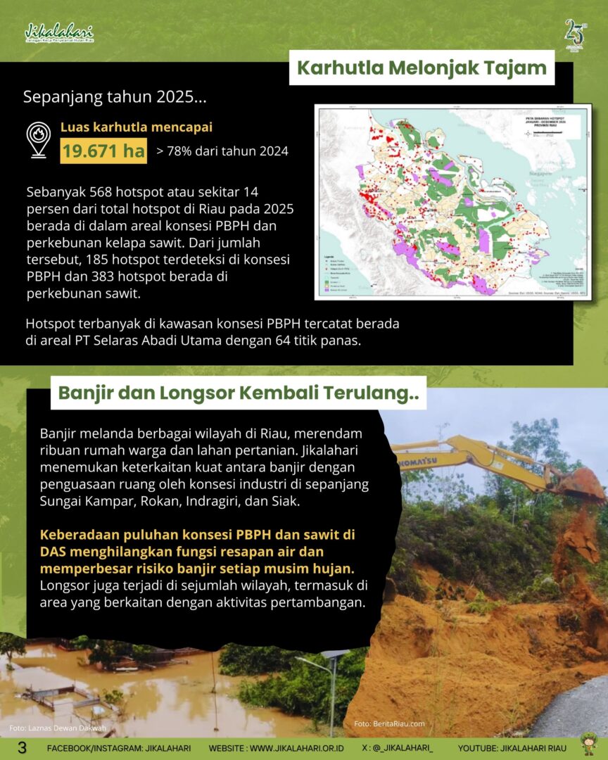 Disamping itu, banjir kembali melanda berbagai wilayah di Riau, merendam ribuan rumah warga dan lahan pertanian. Jikalahari menemukan keterkaitan kuat antara banjir dengan penguasaan ruang oleh konsesi industri di sepanjang Sungai Kampar, Rokan, Indragiri, dan Siak. Keberadaan puluhan konsesi PBPH dan sawit di DAS menghilangkan fungsi resapan air dan memperbesar risiko banjir setiap musim hujan. Longsor juga terjadi di sejumlah wilayah, termasuk di area yang berkaitan dengan aktivitas pertambangan.