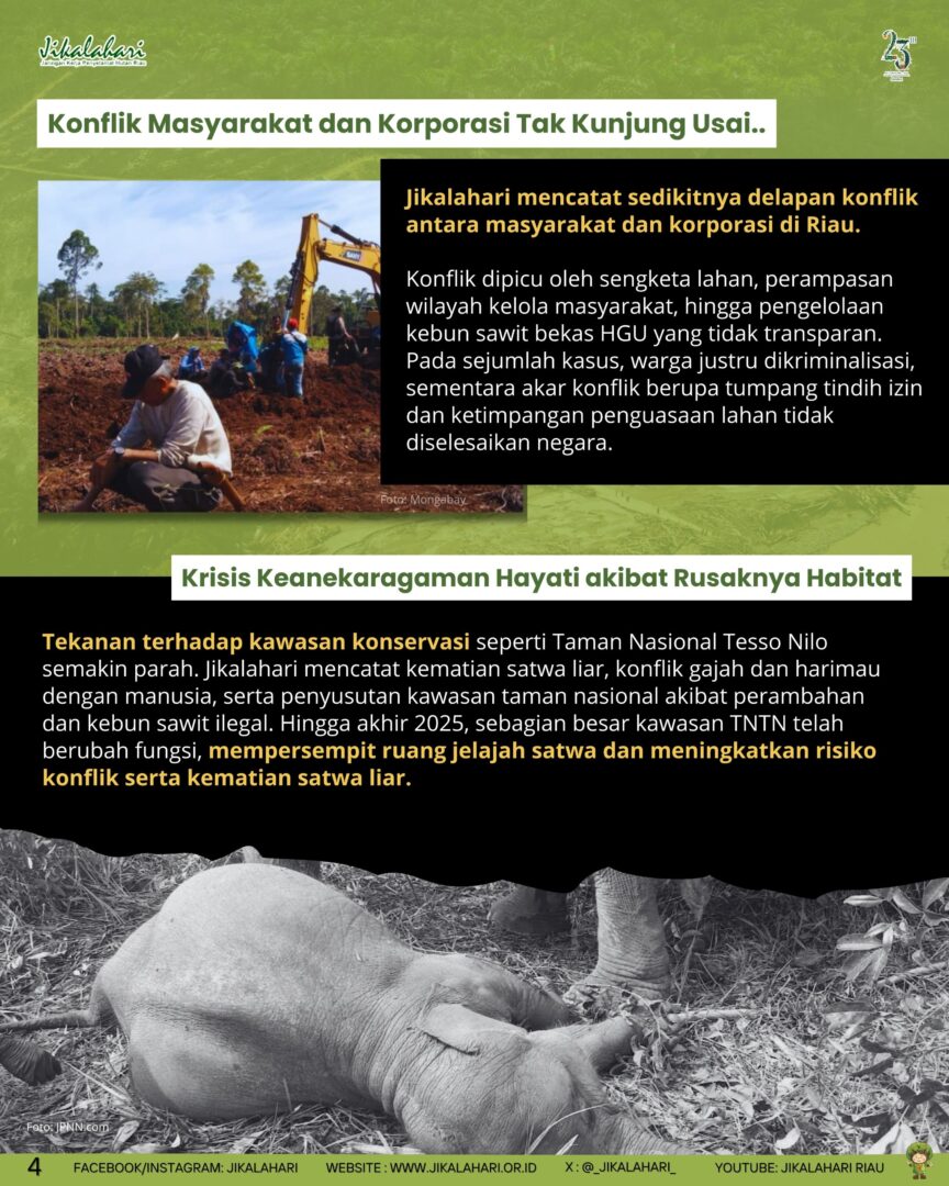 Jikalahari mencatat sedikitnya delapan konflik antara masyarakat dan korporasi di Riau. Konflik dipicu oleh sengketa lahan, perampasan wilayah kelola masyarakat, hingga pengelolaan kebun sawit bekas HGU yang tidak transparan. Pada sejumlah kasus, warga justru dikriminalisasi, sementara akar konflik berupa tumpang tindih izin dan ketimpangan penguasaan lahan tidak diselesaikan negara.