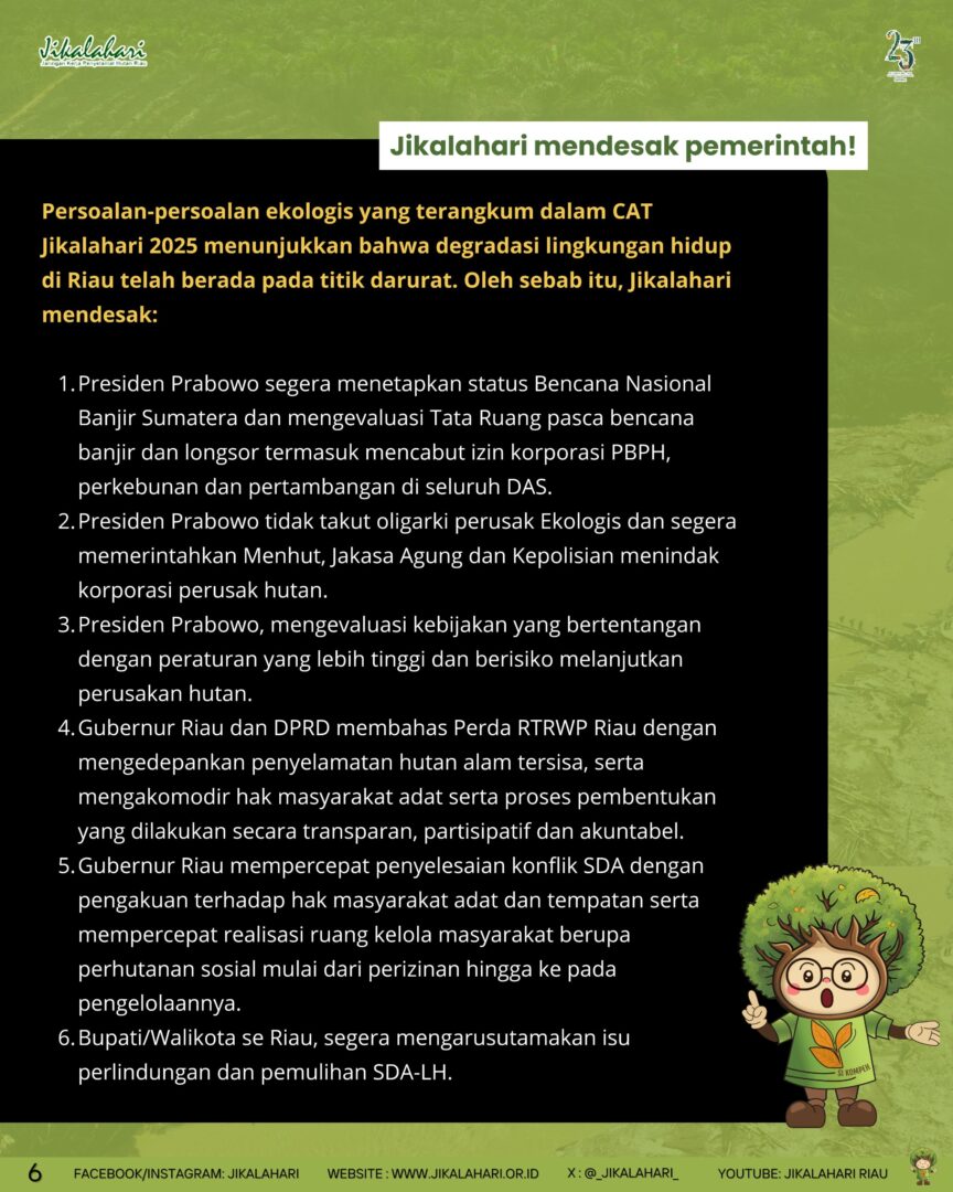 Persoalan-persoalan ekologis yang terangkum dalam CAT Jikalahari 2025 menunjukkan bahwa degradasi lingkungan hidup di Riau telah berada pada titik darurat. Oleh sebab itu, Jikalahari mendesak: