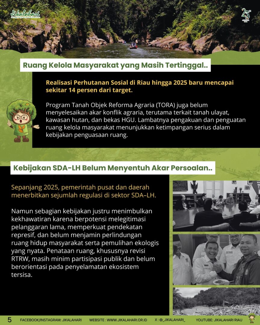 Realisasi Perhutanan Sosial di Riau hingga 2025 baru mencapai sekitar 14 persen dari target. Program Tanah Objek Reforma Agraria (TORA) juga belum menyelesaikan akar konflik agraria, terutama terkait tanah ulayat, kawasan hutan, dan bekas HGU. Lambatnya pengakuan dan penguatan ruang kelola masyarakat menunjukkan ketimpangan serius dalam kebijakan penguasaan ruang.