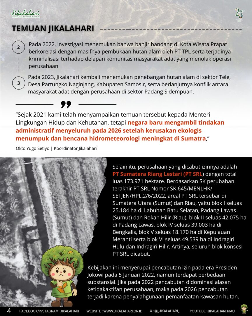 “Sejak 2021 kami telah menyampaikan temuan tersebut kepada Menteri Lingkungan Hidup dan Kehutanan, tetapi negara baru mengambil tindakan administratif menyeluruh pada 2026 setelah kerusakan ekologis menumpuk dan bencana hidrometeorologi meningkat di Sumatra,” ujar Okto.