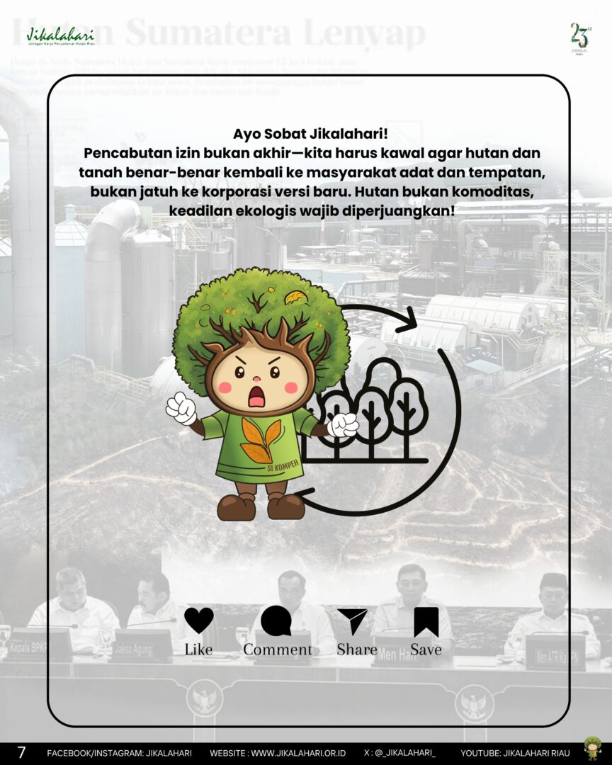 “Pencabutan izin menjadi sinyal penting bahwa negara akhirnya mengakui kerusakan ekologis yang ditimbulkan oleh korporasi besar di sektor kehutanan, perkebunan, dan tambang. Tetapi sejarah menunjukkan konsesi yang dicabut tidak otomatis kembali kepada masyarakat adat dan tempatan, melainkan berpotensi dialihkan kepada korporasi lain” kata Okto Yugo Setyo, Koordinator Jikalahari.