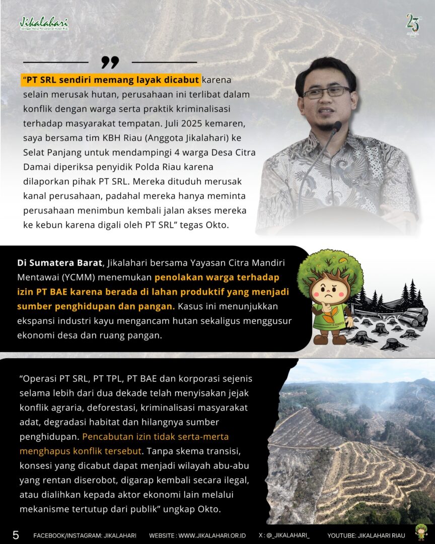 “PT SRL sendiri memang layak dicabut karena selain merusak hutan, perusahaan ini terlibat dalam konflik dengan warga serta praktik kriminalisasi terhadap masyarakat tempatan. Juli 2025 kemaren, saya bersama tim KBH Riau (Anggota Jikalahari) ke Selat Panjang untuk mendampingi 4 warga Desa Citra Damai diperiksa penyidik Polda Riau karena dilaporkan pihak PT SRL. Mereka dituduh merusak kanal perusahaan, padahal mereka hanya meminta perusahaan menimbun kembali jalan akses mereka ke kebun karena digali oleh PT SRL” tegas Okto.