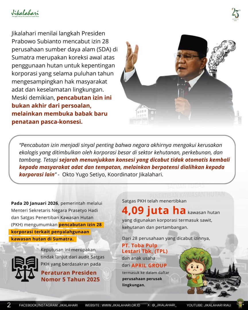 Pekanbaru, 21 Januari 2026 – Jikalahari menilai langkah Presiden Prabowo Subianto mencabut izin 28 perusahaan sumber daya alam (SDA) di Sumatra merupakan koreksi awal atas penggunaan hutan untuk kepentingan korporasi yang selama puluhan tahun mengesampingkan hak masyarakat adat dan keselamatan lingkungan. Meski demikian, pencabutan izin ini bukan akhir dari persoalan, melainkan membuka babak baru penataan pasca-konsesi.