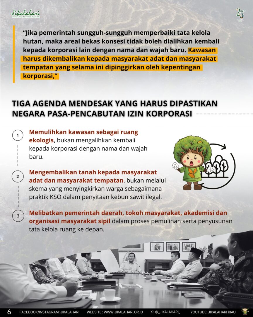 Untuk itu, pasca-pencabutan Jikalahari menilai terdapat tiga agenda mendesak yang harus dipastikan negara: