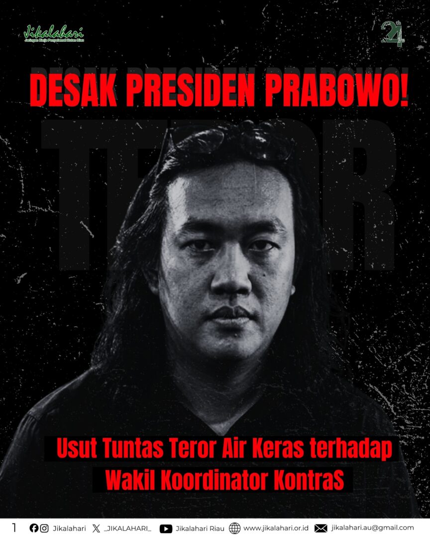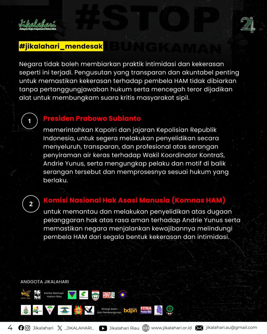 Pekanbaru, 13 Maret 2026 — Jaringan Kerja Penyelamat Hutan Riau (Jikalahari) yang beranggotakan 19 organisasi lingkungan hidup di Riau, mengutuk tindakan penyiraman air keras yang dialami Wakil Koordinator Komisi untuk Orang Hilang dan Korban Tindak Kekerasan (KontraS), Andrie Yunus, oleh orang tidak dikenal (OTK) pada 13 Maret 2026 di Jakarta. Jikalahari juga menyampaikan solidaritas kepada Andrie Yunus dan keluarga serta mendesak aparat penegak hukum untuk segera mengusut tuntas pelaku dan mengungkap motif di balik serangan tersebut.