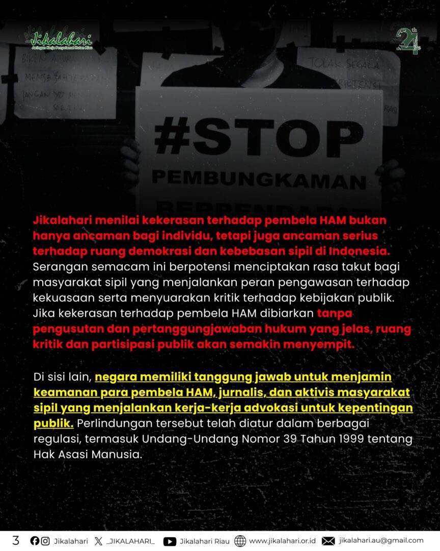 Jikalahari menilai kekerasan terhadap pembela HAM bukan hanya ancaman bagi individu, tetapi juga ancaman serius terhadap ruang demokrasi dan kebebasan sipil di Indonesia. Serangan semacam ini berpotensi menciptakan rasa takut bagi masyarakat sipil yang menjalankan peran pengawasan terhadap kekuasaan serta menyuarakan kritik terhadap kebijakan publik. Jika kekerasan terhadap pembela HAM dibiarkan tanpa pengusutan dan pertanggungjawaban hukum yang jelas, ruang kritik dan partisipasi publik akan semakin menyempit.