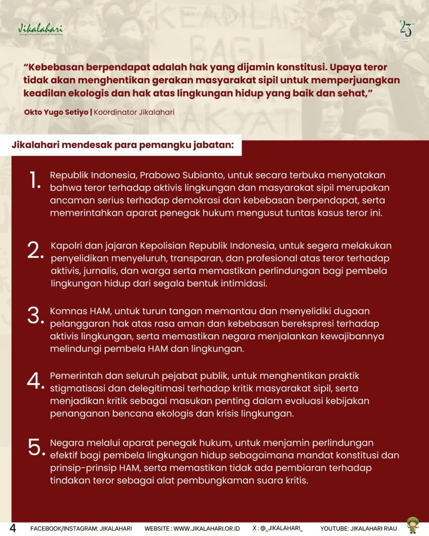 Untuk itu Jikalahari mendesak kepada: Presiden Republik Indonesia, Prabowo Subianto, untuk secara terbuka menyatakan bahwa teror terhadap aktivis lingkungan dan masyarakat sipil merupakan ancaman serius terhadap demokrasi dan kebebasan berpendapat, serta memerintahkan aparat penegak hukum mengusut tuntas kasus teror ini.