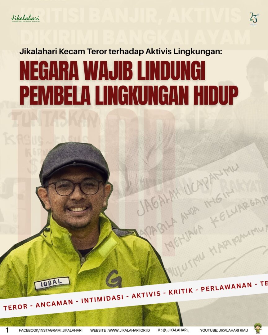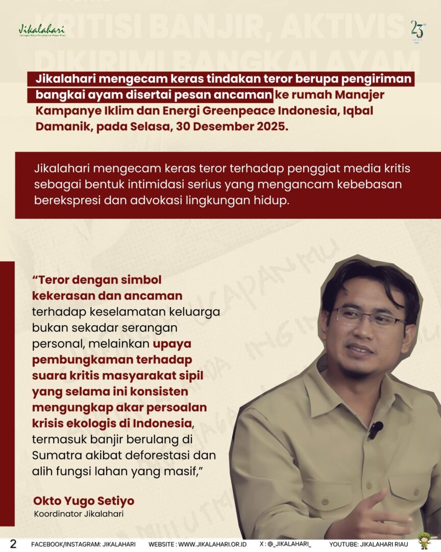 Pekanbaru, 1 januari 2026 – Jikalahari mengecam keras tindakan teror berupa pengiriman bangkai ayam disertai pesan ancaman ke rumah Manajer Kampanye Iklim dan Energi Greenpeace Indonesia, Iqbal Damanik, pada Selasa, 30 Desember 2025. Jikalahari juga mengecam teror kepada para penggiat media yang kritis terhadap isu publik dan kebijakan Pemerintah. Tindakan tersebut merupakan bentuk intimidasi serius terhadap kebebasan berekspresi dan kerja-kerja advokasi lingkungan hidup.