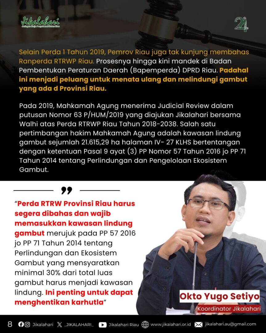 Pada 2019, Mahkamah Agung menerima Judicial Review dalam putusan Nomor 63 P/HUM/2019 yang diajukan Jikalahari bersama Walhi atas Perda RTRWP Riau Tahun 2018-2038. Salah satu pertimbangan hakim Mahkamah Agung adalah kawasan lindung gambut sejumlah 21.615,29 ha halaman IV- 27 KLHS bertentangan dengan ketentuan Pasal 9 ayat (3) PP Nomor 57 Tahun 2016 jo PP 71 Tahun 2014 tentang Perlindungan dan Pengelolaan Ekosistem Gambut.
