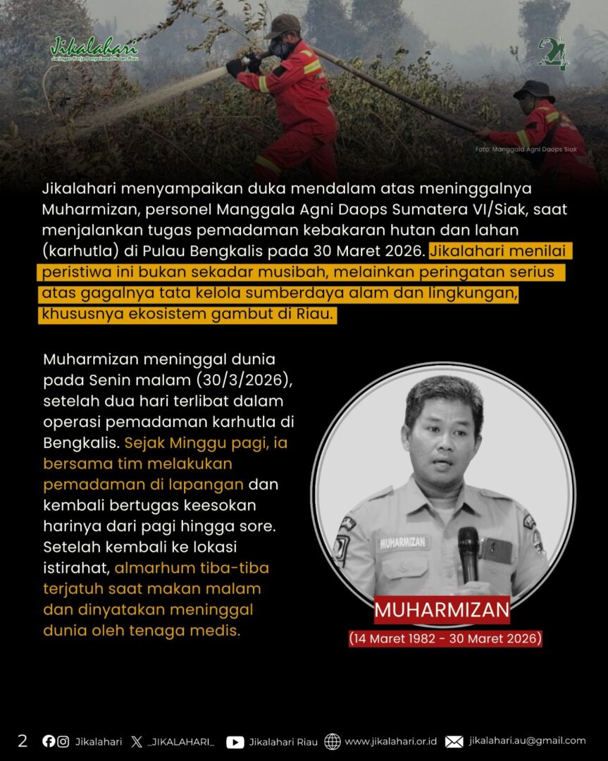 Pekanbaru, 1 April 2026- Jikalahari menyampaikan duka mendalam atas meninggalnya Muharmizan, personel Manggala Agni Daops Sumatera VI/Siak, saat menjalankan tugas pemadaman kebakaran hutan dan lahan (karhutla) di Pulau Bengkalis pada 30 Maret 2026. Jikalahari menilai peristiwa ini bukan sekadar musibah, melainkan peringatan serius atas gagalnya tata kelola sumberdaya alam dan lingkungan, khususnya ekosistem gambut di Riau.