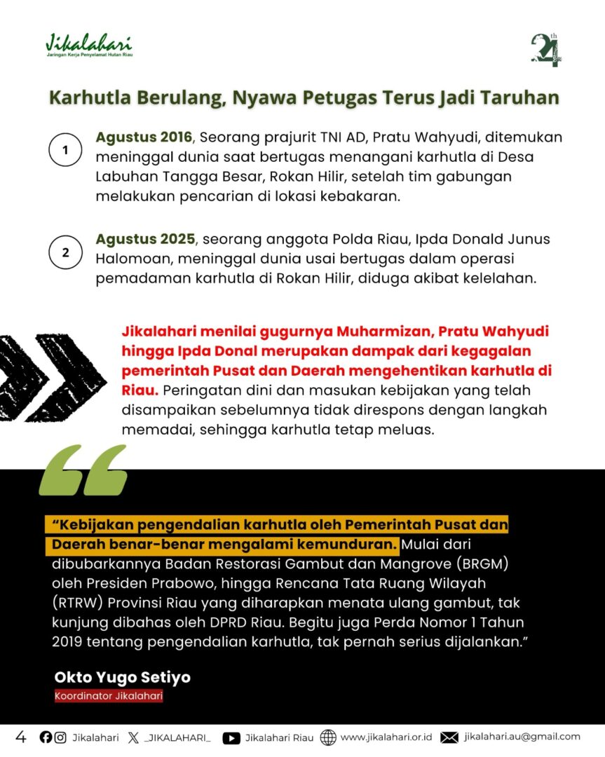 “Peristiwa pilu ini mestinya tidak perlu terjadi jika penyebab karhutla ini serius diatasi. Kami melihat belum ada kebijakan serius untuk pemulihan ekosistem gambut yang ada di Riau, justru kebijakan baik di tingkat pusat maupun daerah mengalami kemunduran serius,” kata Okto Yugo Setiyo.