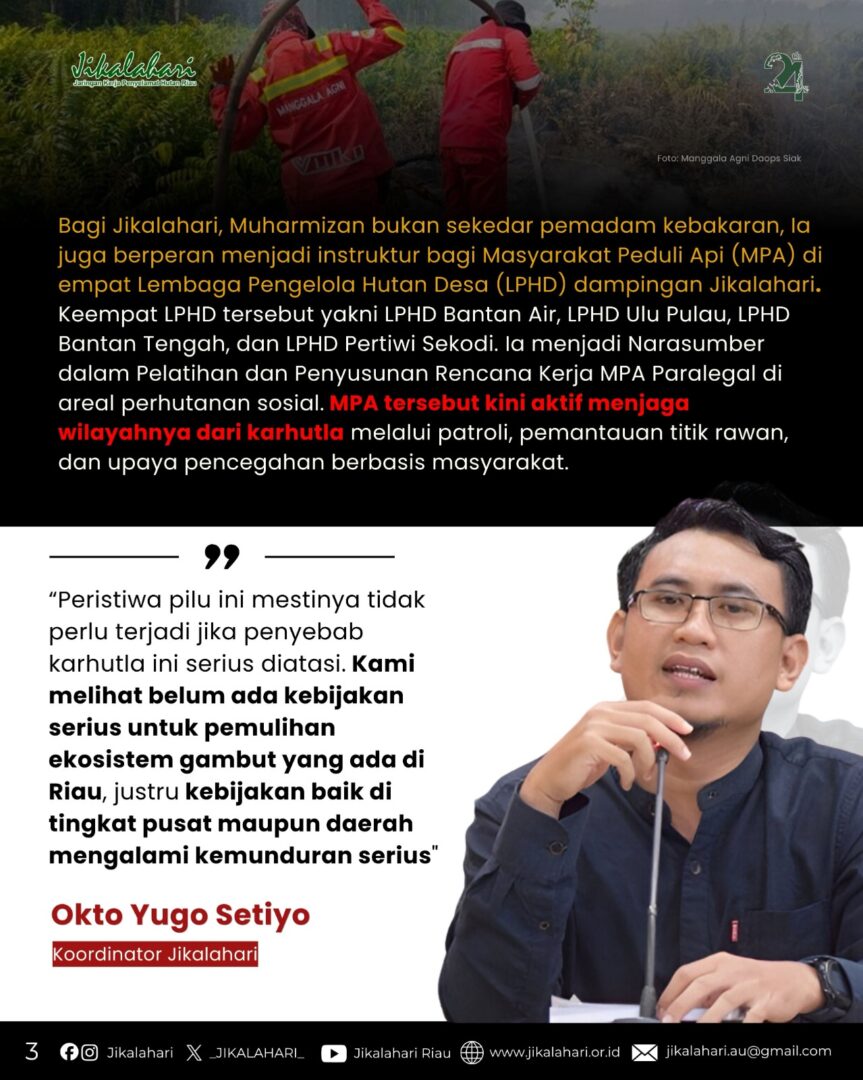 Bagi Jikalahari, Muharmizan bukan sekedar pemadam kebakaran, Ia juga berperan menjadi instruktur bagi Masyarakat Peduli Api (MPA) di empat Lembaga Pengelola Hutan Desa (LPHD) dampingan Jikalahari. Keempat LPHD tersebut yakni LPHD Bantan Air, LPHD Ulu Pulau, LPHD Bantan Tengah, dan LPHD Pertiwi Sekodi. Ia menjadi Narasumber dalam Pelatihan dan Penyusunan Rencana Kerja MPA Paralegal di areal perhutanan sosial. MPA tersebut kini aktif menjaga wilayahnya dari karhutla melalui patroli, pemantauan titik rawan, dan upaya pencegahan berbasis masyarakat.