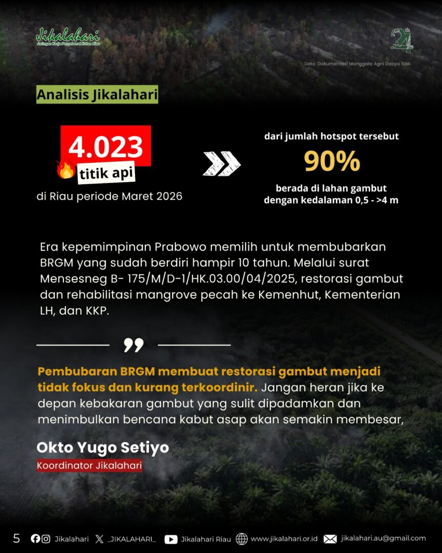 Kebakaran hutan masih dominan terjadi di kawasan gambut. Analisis Jikalahari melaui citra satelit Suomi NPP–VIIRS pada periode periode Maret 2026, terdeteksi sebanyak 1.708 titik panas (hotspot) di Riau. Dari jumlah tersebut, sebanyak 1.530 titik atau 90% berada di lahan gambut dengan kedalaman 0,5 hingga lebih dari 4 meter