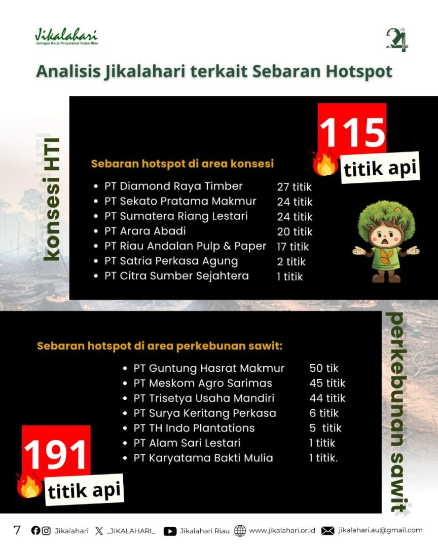 Analisis Jikalahari menemukan hotspot masih ditemukan di areal korporasi. Ada 306 titik hotspot berada di dalam kawasan konsesi. Sebanyak 115 hotspot teridentifikasi berada di dalam kawasan konsesi hutan tanaman industri (HTI). Sebaran hotspot tersebut antara lain berada di PT Diamond Raya Timber sebanyak 27 titik, PT Sekato Pratama Makmur 24 titik, PT Sumatera Riang Lestari 24 titik, PT Arara Abadi 20 titik, PT Riau Andalan Pulp & Paper 17 titik, PT Satria Perkasa Agung 2 titik, dan PT Citra Sumber Sejahtera 1 titik.