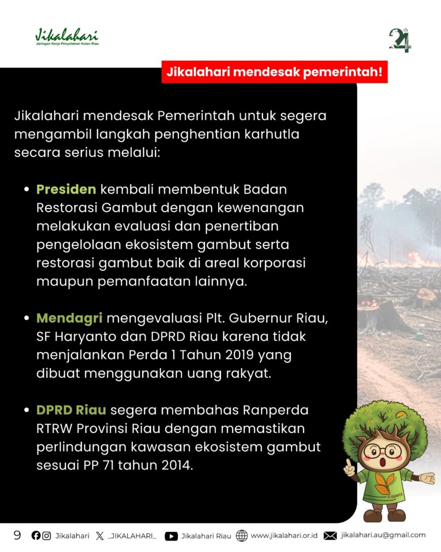 Jikalahari mendesak Pemerintah untuk segera mengambil langkah penghentian karhutla secara serius melalui:
