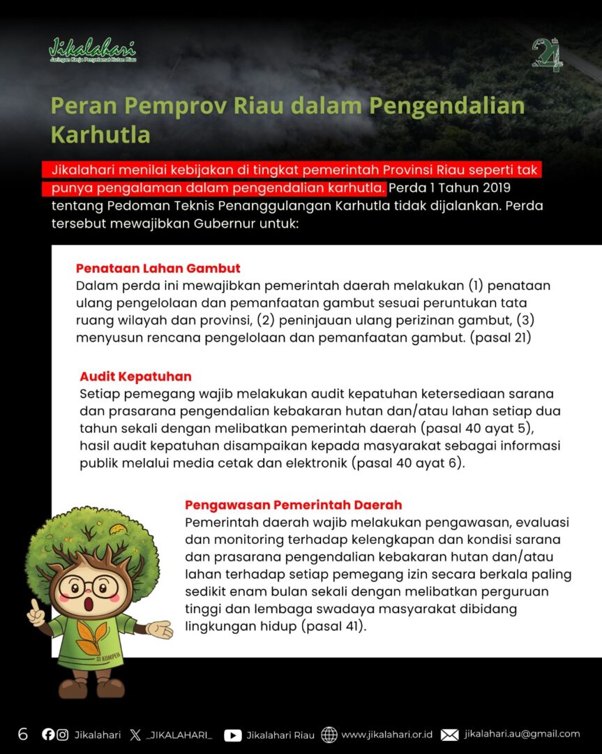 Begitu juga kebijakan di tingkat pemerintah Provinsi Riau yang seperti tak punya pengalaman dalam pengendalian karhutla. Perda 1 Tahun 2019 tentang Pedoman Teknis Penanggulangan Karhutla tidak dijalankan. Perda tersebut mewajibkan Gubernur untuk: