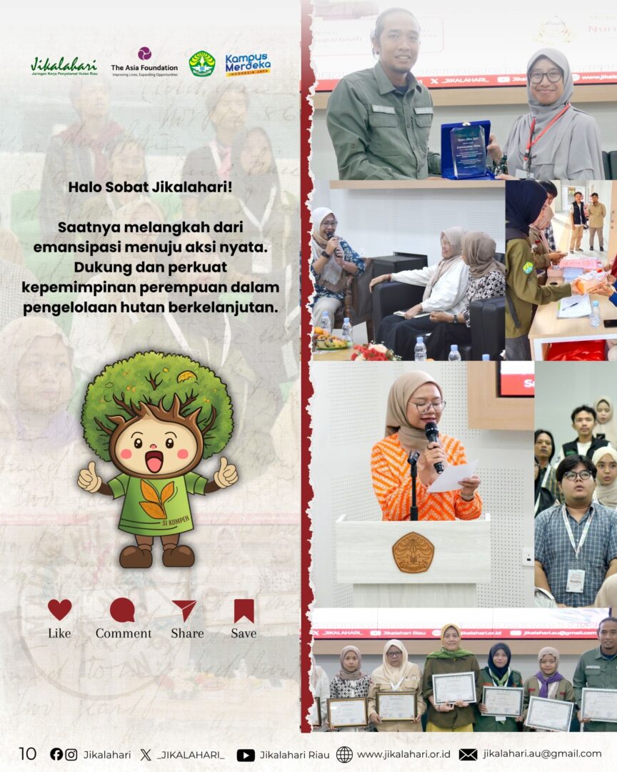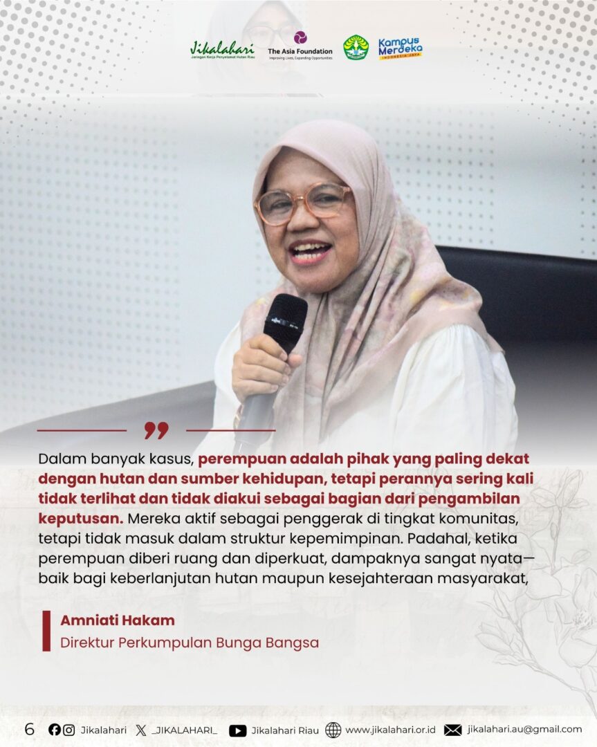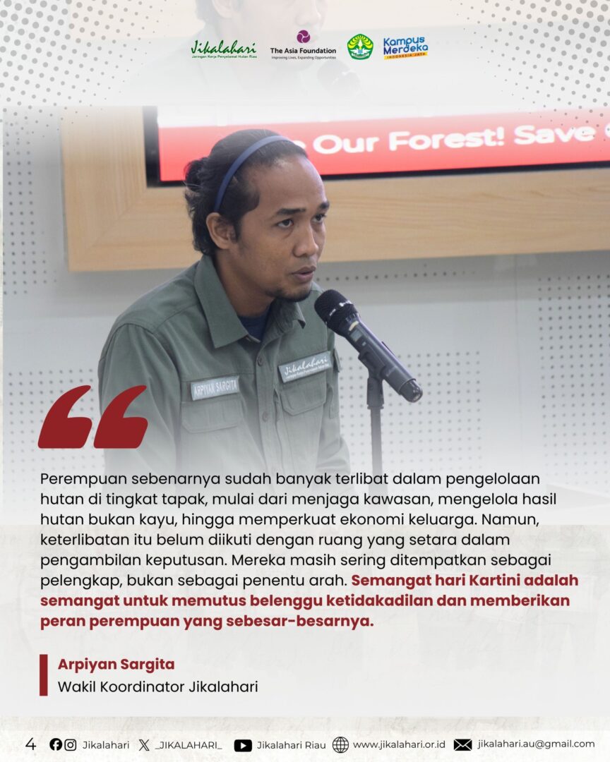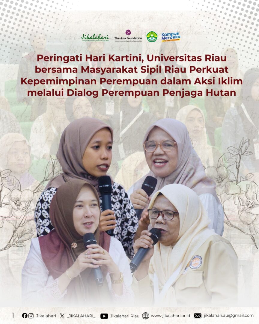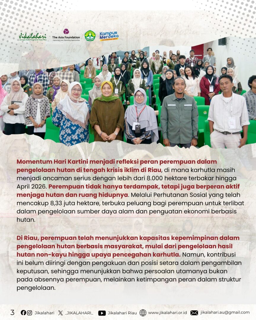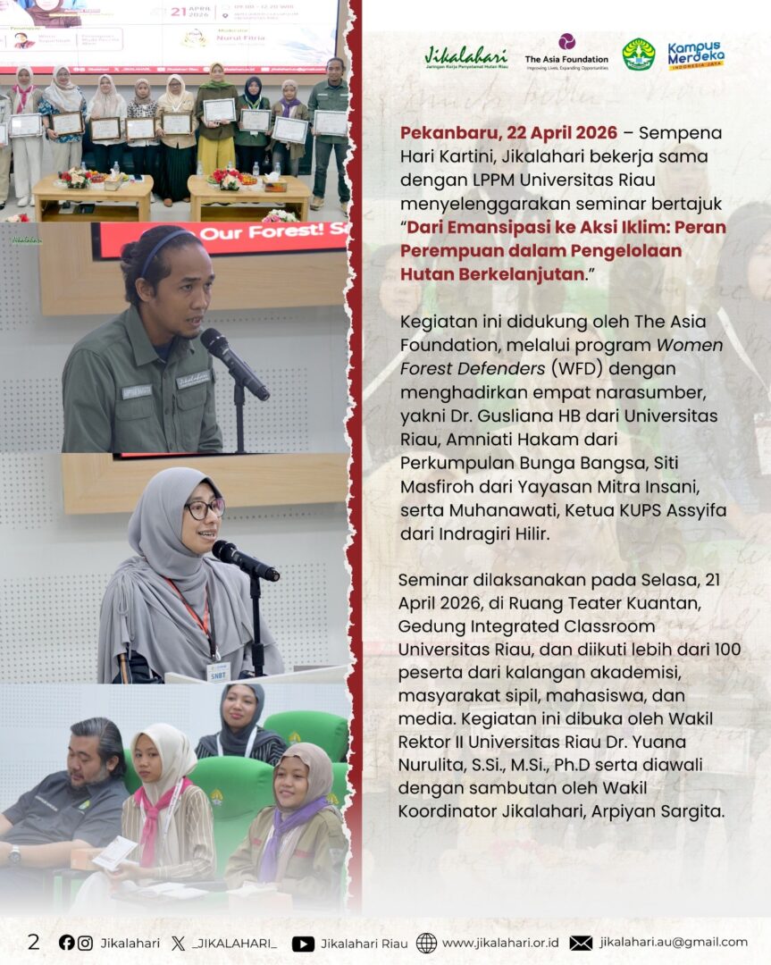 Pekanbaru, 22 April 2026 – Sempena Hari Kartini, Jikalahari bekerja sama dengan LPPM Universitas Riau menyelenggarakan seminar bertajuk “Dari Emansipasi ke Aksi Iklim: Peran Perempuan dalam Pengelolaan Hutan Berkelanjutan.” Kegiatan ini didukung oleh The Asia Foundation, melalui program Women Forest Defenders (WFD) dengan menghadirkan empat narasumber, yakni Dr. Gusliana HB dari Universitas Riau, Amniati Hakim dari Perkumpulan Bunga Bangsa, Siti Masfiroh dari Yayasan Mitra Insani, serta Muhanawati, Ketua KUPS Assyifa dari Indragiri Hilir.