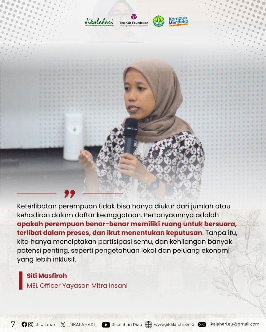 “Keterlibatan perempuan tidak bisa hanya diukur dari jumlah atau kehadiran dalam daftar keanggotaan. Pertanyaannya adalah apakah mereka benar-benar memiliki ruang untuk bersuara, terlibat dalam proses, dan ikut menentukan keputusan. Tanpa itu, kita hanya menciptakan partisipasi semu, dan kehilangan banyak potensi penting, seperti pengetahuan lokal dan peluang ekonomi yang lebih inklusif,” tutur Siti.
