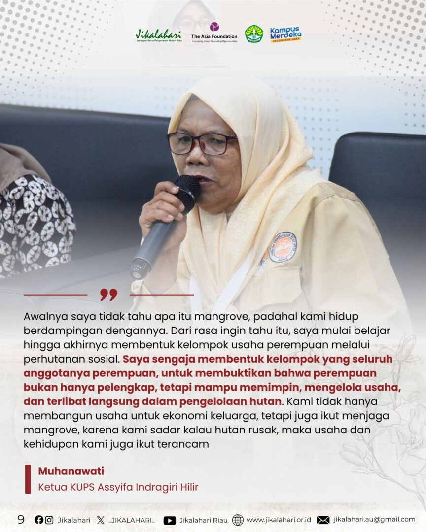 Diskusi ini juga menghadirkan pengalaman langsung dari perempuan pengelola hutan di tingkat tapak, yang menunjukkan bahwa perempuan tidak hanya mampu berkontribusi, tetapi juga menjadi aktor penting dalam menjaga keberlanjutan hutan dan ekonomi komunitas. Muhanawati, Ketua KUPS Assyifa dari Indragiri Hilir, membagikan pengalaman bagaimana perempuan mulai terlibat dan membangun inisiatif dari tingkat tapak.
