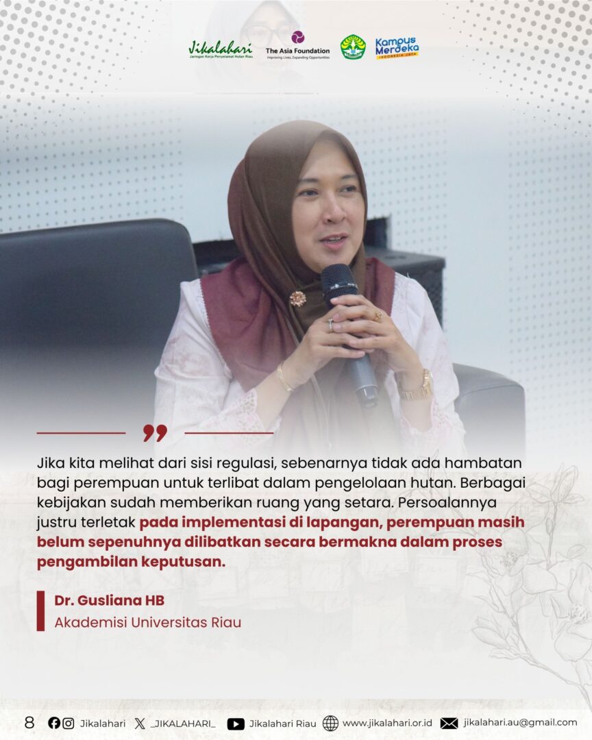 Sementara itu, akademisi Universitas Riau, Dr. Gusliana HB, SH., M.Hum., menyampaikan bahwa kesetaraan gender dalam pengelolaan hutan sebenarnya telah dijamin dalam berbagai regulasi.