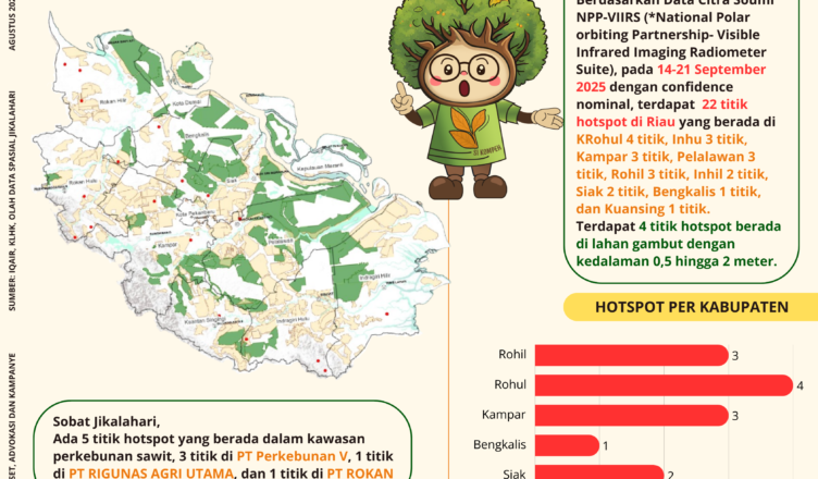 Berdasarkan Data Citra Soumi NPP-VIIRS (National Polar orbiting Partnership- Visible Infrared Imaging Radiometer Suite), pada 14-21 September 2025 terdapat 22 hotspot yang tersebar di: Rokan Hulu 4 titik, Rokan Hilir 3 titik, Kampar 3 titik,Bengkalis 1 titik, Siak 2 titik, Pelalawan 3 titik, Indragiri Hilir 2 titik, Indragiri Hulu 3 titik dan Kuansing 1 titik.